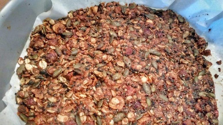 Riscalda il forno a 160° e tosta per 8 minuti in una teglia larga avena, germe di grano, semi di girasole, sesamo e nocciole. Nel frattempo sciogli in un pentolino il burro, il burro d’arachidi, zucchero di canna e miele. Tieni il fuoco molto basso e mescola continuamente fino a farne uno sciroppo. Togli la teglia con gli elementi tostati, spezzetta grossolanamente le nocciole e unisci la frutta secca e il sale, mescola per amalgamare bene il tutto e schiaccialo su un foglio di carta da forno in una teglia capiente. Informa e lascia cuocere il tutto per 25 minuti a 140°. Lascia freddare completamente prima di tagliarlo con un coltello molto affilato.