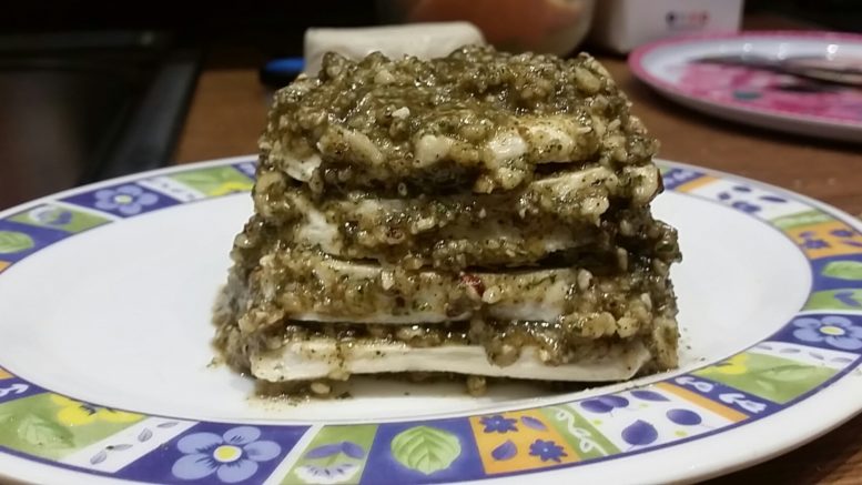 Prepara una salsa con le noci, i pinoli, le nocciole, il prezzemolo, il basilico, una buona dose di olio d’oliva e un pizzico di sale. Spalmate questa salsa sul fondo di una piccola pirofila e adagiatevi sopra una fetta di tofu, non più alta di mezzo centimetro, alternate altri strati così composti. Alla fine versate un pò d’olio d’oliva. Tenetelo a macerare per almeno due giorni (non più di 7 giorni).