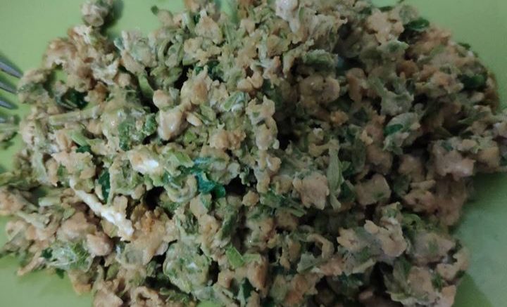 Avevo gia parlato di questo tipo di germogli, molto usati in cucina qui in Cina (come i tanti altri tipi di germogli, su cui intendo scrivere qualcosa in futuro). Era la prima volta che provavo a farlo da solo, ma mi era piaciuto troppo quando l’avevo assaggiato tempo fa vicino a un tempio, e ho deciso di provare. I germogli sono facilmente acquistabili in mazzetti in qualunque fruttivendolo (io li ho acquistati online da un mercato ortofrutticolo nelle vicinanze, con consegna in 30 minuti, dato che non potevo andare di persona). La parte più importante della ricetta è la bollitura dei germogli per almeno 1 minuto, cosa che elimina alcune sostanze tossiche contenute nei germogli crudi. Da rossicci, i germogli diventano quindi di un colore verde acceso. Subito dopo vanno asciugati e tritati al coltello, mescolati con erba cipollina e mescolati con uovo e un po’ di sale. Dopodiché si passa alla cottura: si scalda un po’ di olio vegetale in una padella e si versa il composto di uova, erba cipollina e germogli, mescolandolo bene durante la cottura per evitare che si trasformi in una “frittata”. Il risultato può essere gustato caldo o anche a temperatura ambiente. Il gusto “fresco” e delicato dei germogli si sposa perfettamente con quello aromatico dell’erba cipollina e quello più neutro delle uova.