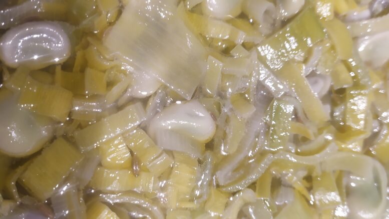 Pulite i baccelli e il porro. Tritate finemente entrambi e mettete in una casseruola insieme a poca acqua e tutto il resto degli ingredienti. Cuocete tappato per 10′. È pronto.