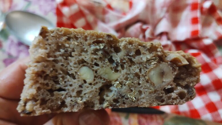 Impasta tutti gli ingredienti eccetto lievito, noci e semi per 5′ dopo di che aggiungi il lievito e impasta per altri 5′. Unisci noci e semi e lascia lievitare per almeno 2 ore, meglio una notte, coperto da un panno caldo e umido. Metti in forno preriscaldato a 220° praticando prima dei taglietti orizzontali e tienilo in forno per 15’ dopo di che abbassa la temperatura a 180° e lascia correre per altri 35’. Ricorda di non aprire mai per nessun motivo il forno nella prima mezz’ora di cottura!