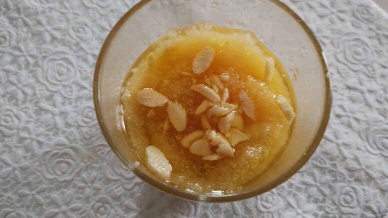 Inizia preparando uno sciroppo con 300 ml di acqua e lo zucchero. Porta ad ebollizione il tutto e lascia sobbollire per 5′. A parte sciogli il burro e unisci il semolino, mescola il tutto per rendere omogeneo. Unisci poi lo sciroppo e gira. Metti anche le capsule di cardamomo leggermente incise, continua a mescolare. Unisci anche l’ uvetta e le mandorle, conservarne qualcuna per decorare sopra. Metti nei bicchieri, decora con le mandorle. È pronto. Consumalo caldo.